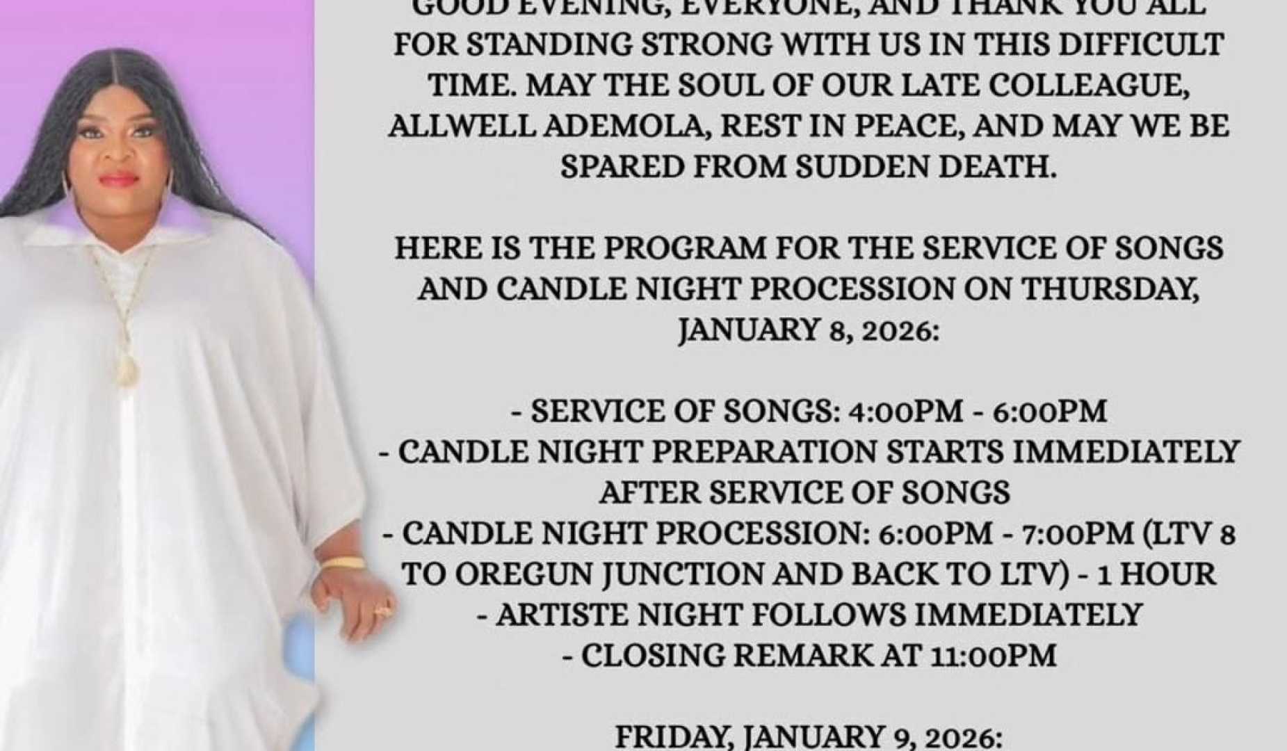 During di candlelight procession and service of songs, fam and naija stars like Iyabo Ojo, Fausat Balogun and many others gather to remember her. Dem wear white T-shirts wey get her picture, to show say they dey mourn. Seriously, e be like say dem just dey finish one big film for person wey touch dem lives.
