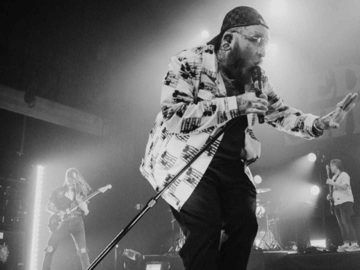 Di biggest surprise come last. David Lee Roth jump out with leather vest and tight pants. E and Swims tackle Van Halen hit “Jump.” Dem even miss verse small, laugh am off. Roth dey smile as e stand for catwalk, crowd dey shout lyrics. Old school meet new generation.