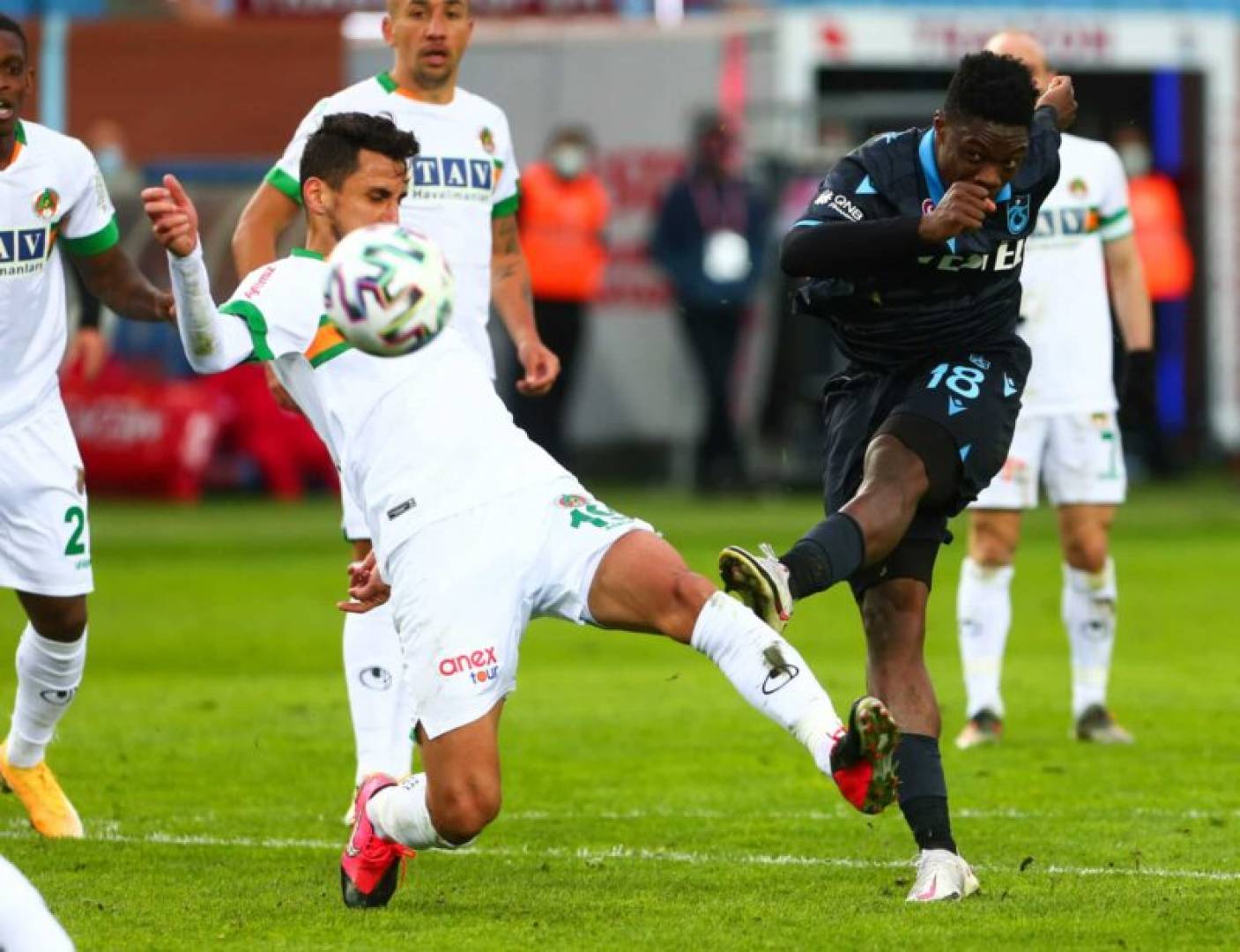 First half begin with both teams careful. Minute 5, Alanyaspor get corner, Ümit Akdağ header miss small. Trabzonspor try their own chance minute 14 when Oulai run pass defenders but shot block. Minute 17, Pina get clear chance after Savic long pass, but him chip over goalkeeper Victor no work.