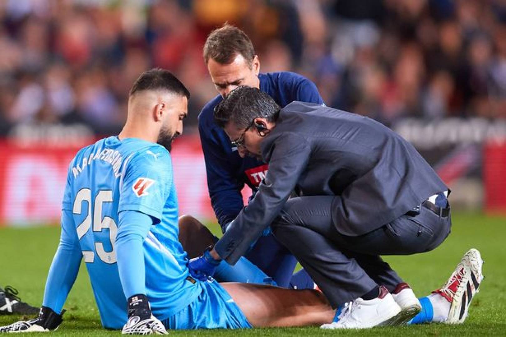Mamardashvili remain for ground with serious pain after di incident. Liverpool medical team treat am for some minutes before dem call stretcher carry am off di field. Di keeper face look like serious wahala as dem carry am go.
